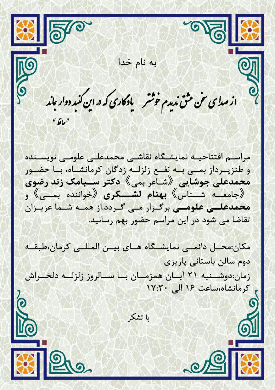 1397 افتتاح نمایشگاه نقاشی محمدعلی علومی نویسندهی رمانهای پریباد و سوگ مغان به نفع زلزلهزدگان کرمانشاه در کرمان 20 آبان 1397 برچسب ها: پریباد, محمدعلی علومی, سوگ مغان قبلی بعدی